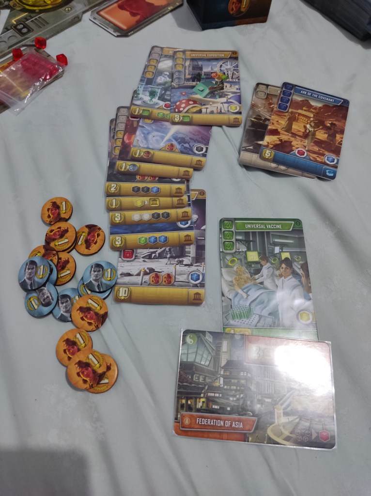Third are the production sequences. In this game, usually we only produce 5 resources, starting from the lowest are Materials, Energy, Science, Gold, and until the highest are Exploration, and if you own the expansion you may produce the 2 characters (Generals and Financiers) and even Krystallium. The first time we play it, we didn’t notice these sequence and we just run all production at the same time with the consequences that our first and second turn production are not that good. But after we knew, suddenly we have a wider option to prioritize the construction and have more rewarding experience from production and better at scoring our points.